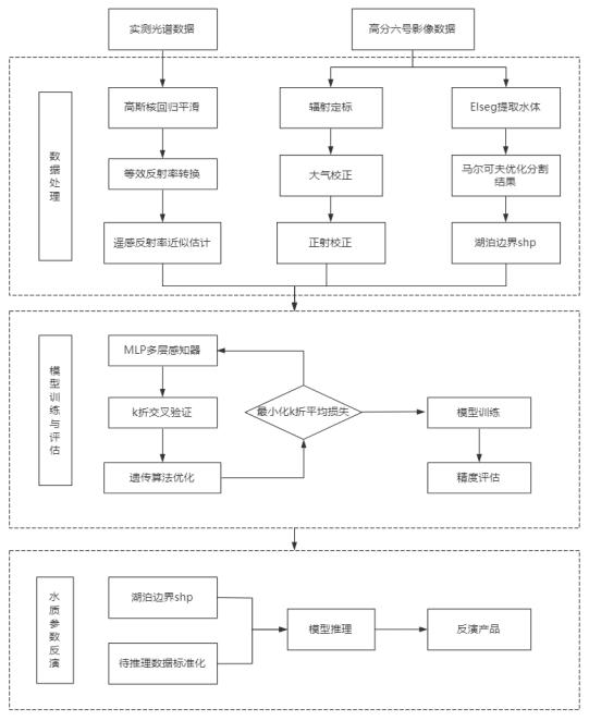 本文采用了基于 MLP 神经网络模型、k 折交叉验证和遗传算法优化神经网络的方法,对水质参数进行反演,并生成了水质参数反演产品。